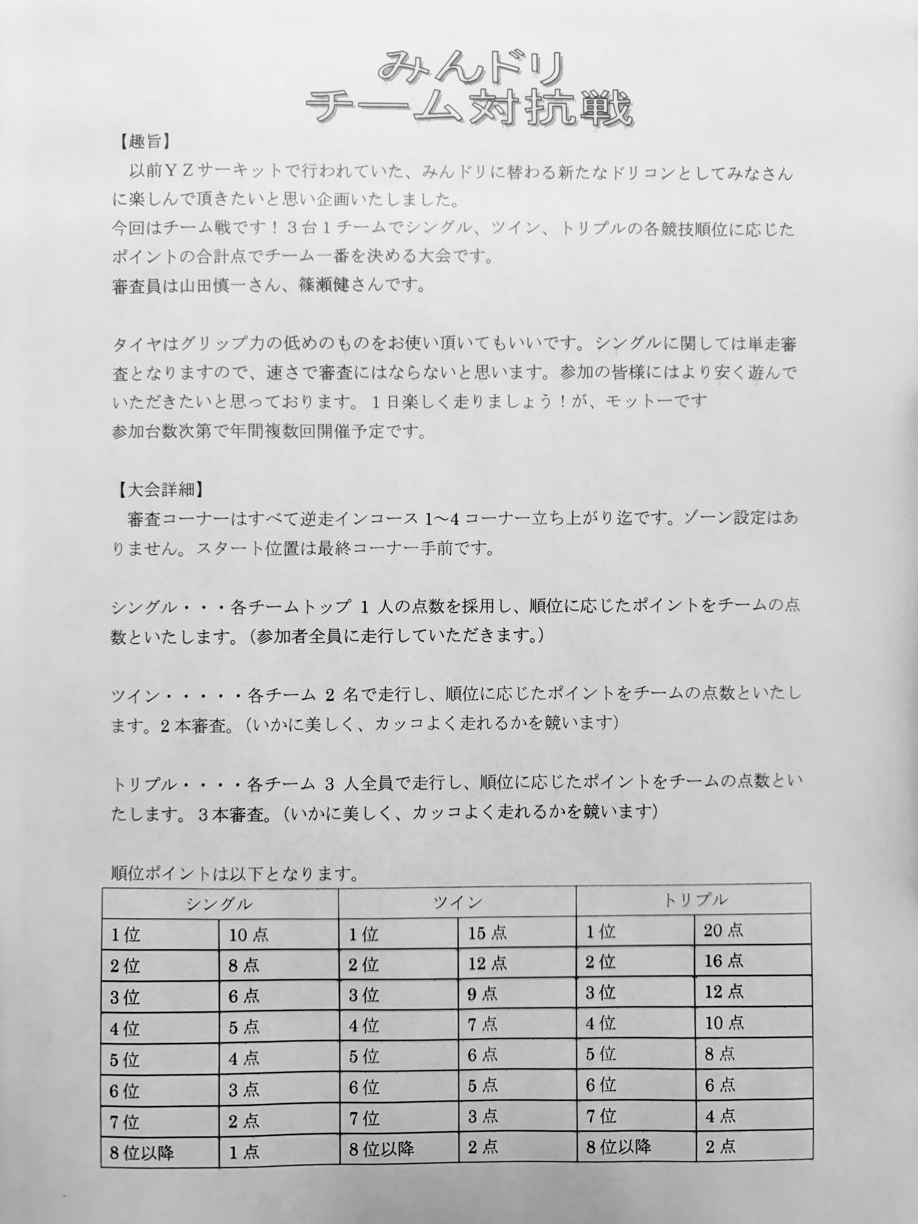 3台1チームでシングル、ツイン、団体の 各競技順位に応じたポイントの合計点で チーム一番を決める大会です。 審査コーナーは逆走インコース 1コーナー~4コーナーを審査。 ゾーン設定はありません。 スタート位置は最終コーナー手前です。 いかに美しく、カッコよく走れるかを競います。 3名揃わない方も参加できます。 |
